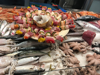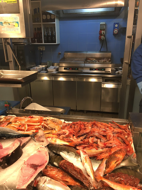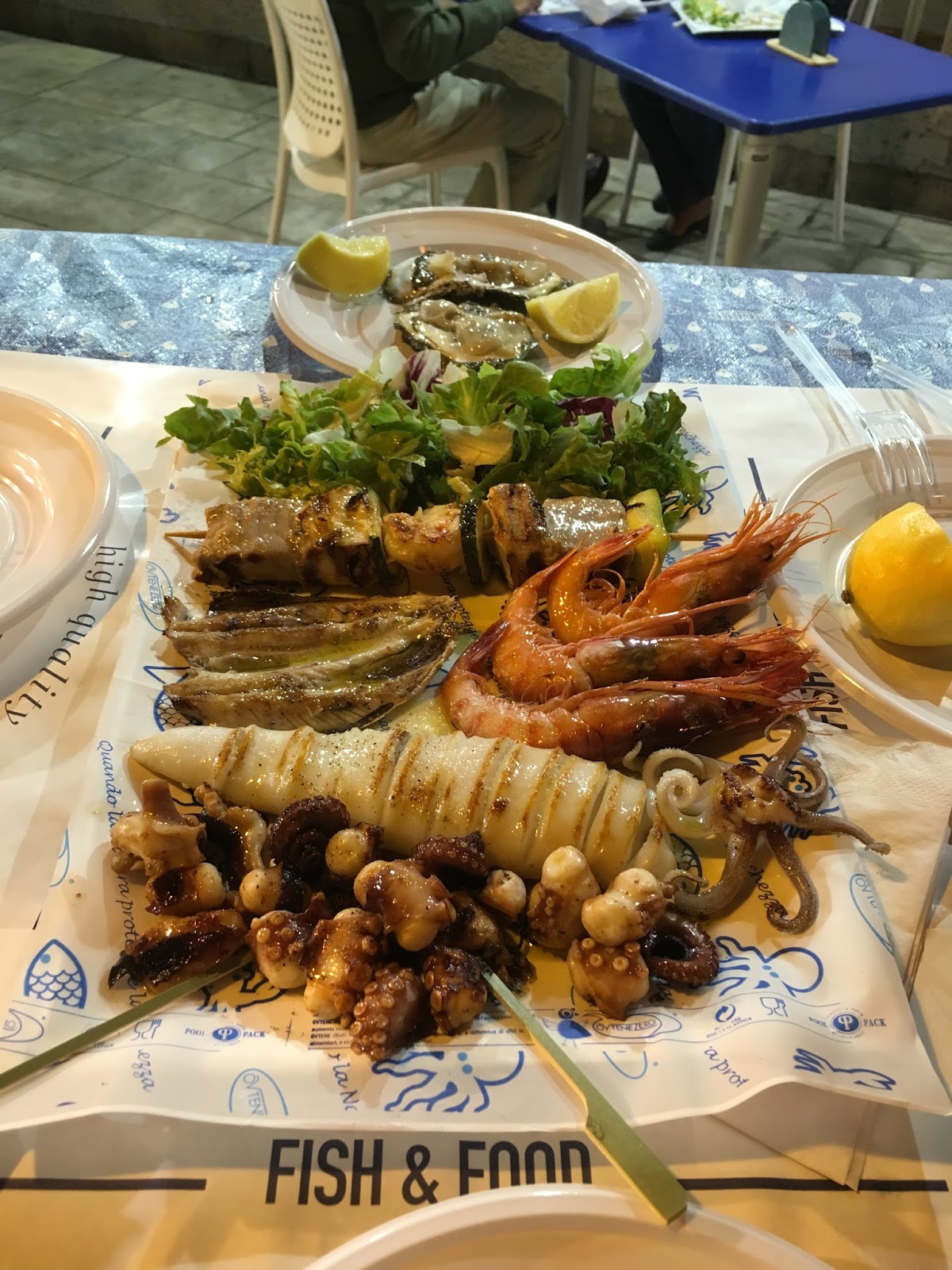 Neturistinio sezono trūkumėlis – daug restoranų nedirba, o dar pirmadienis.. ilgokai paklaidžiojome Vieste mieste, kol radome kur pavalgyti. Suradę, pasiėmėme “Fisch menu”, t.y. turistams skirtą komplektą, kur užkandis, pirmas ir antras patiekalas su žuvimis ir jūros gėrybėmis. Buvo skanu, kai kas net liko nenufotografuota. Du rinkiniai (jų pilnai užteko trims pavalgyti) plius vynas kainavo 38 eur.