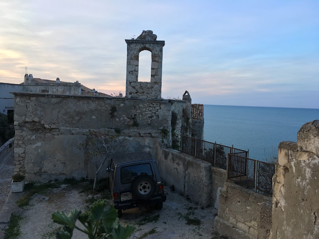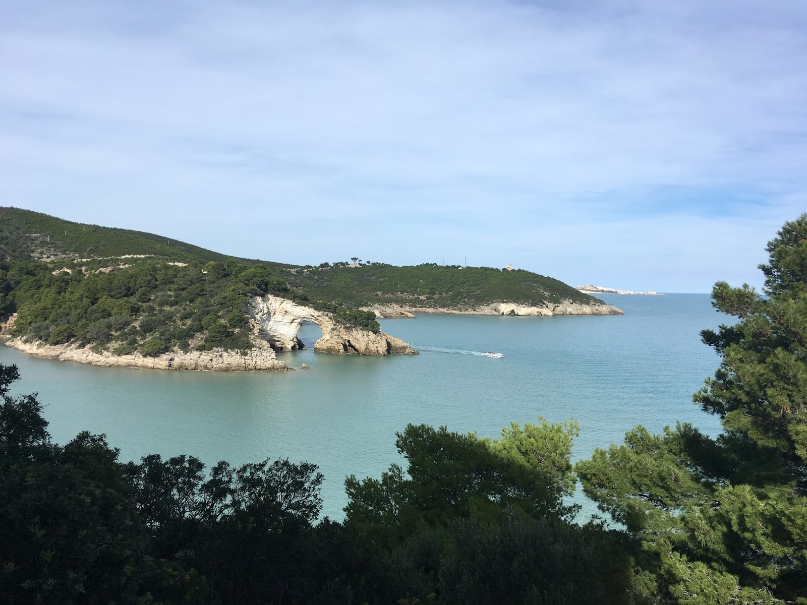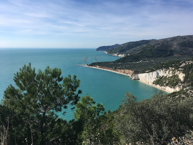 Įsikūrę, patraukiame tolyn Gargano pusiasalio pakrante, link Peschici. Atstumas mažiau nei 25 km, bet kelias vingiuoja, todėl užtrunkame beveik valandą. Ši kelio atkarpa sukėlė keistą jausmą – visus tuos kilometrus nenutrūkstamai apibus kelio tęsiasi kempingų ir viešbučių teritorijos. Didžiuliai plotai, kuriuos sezono metu užplūsta turistai. Sunku įsivaizduoti kaip tada atrodo pliažai, kuriuose dabar be mūsų tik vėjai, paukščiai ir vienas kitas žmogus:) O kas darosi šiuose siauruose vingiuotuose keliukuose..?