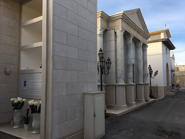Įvažiuojant į Peschici pamatėme kapines, nutarėme sustoti pasivaikščioti, juk ir nuotaika tinkama – artėja lapkričio 1. Vaizdas, bent mane stipriai paveikė… niekada nebuvom matę kapinių kur karstai ne kasami po žeme, bet kraunami į specialaus statinio lentynas. Kai kurie, matyt turtingų šeimų, satiniai įspūdingi – su kolonomis, papuoštos marmuro plokštėmis.. Žmonės, kaip ir pas mus – tvarkosi, šluojasi, merkia ar sodina gėles, skuduriukais blizgina plokštes, kiti tiesiog sėdi ant lauke ar viduje įrengtų suoliukų.. Gal nelabai tinkama mintis, bet – kažin koks kvapas ten būna per karščius.. ar plokštės, kuriomis uždengiama anga sandarios..? Ir kaip jie užkelia karstus į viršutines lentynas, kurios gal 5 m aukštyje….?? Žodžiu, bent kartą, tikrai verta tai pamatyti..