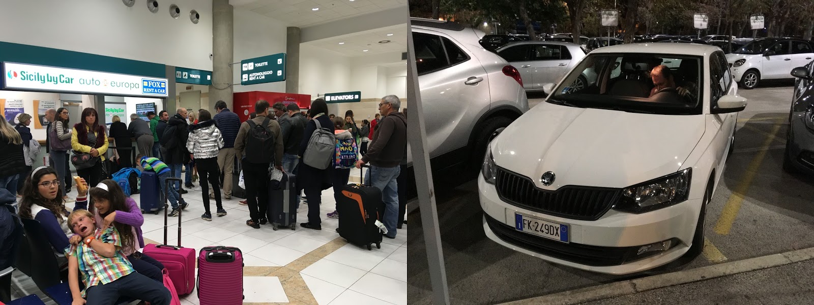 Pirmas sustojimas – ilga lėta eilė prie automobilių nuomos punkto… Kelionę derinome prie moksleivių atostogų, norėjosi savo 12-okę bent trumpam išvežti prasiblaškyi nuo nesibaigiančių chemijų, matematikų ir visų kitų priešegzamininių rūpesčių.. Prie atostogų derinosi ir daugybė kitų šeimų, todėl lėktuvas aidėjo nuo įvairaus amžiaus vaikų balsų ir išmintingų postringavimų, o nusileidus, nuo plojimų:))) daug jų, išlipę persikėlė čia, prie nuomos punkų.. Taigi, stovėdami savo lėtoje eilėje prie “Sicily by Car” punkto, dairėmės į kitus lietuvius, gal jiems, prie žinomesnių nuomos kompanijų, sekasi greičiau..?:) atrodė, kad panašiai kaip mums – eilės ten trumpesnės, bet gal procedūros ilgesnės.. Po pusantros valandos įsėdome į mūsų naują draugę ateinančiai savaitei.