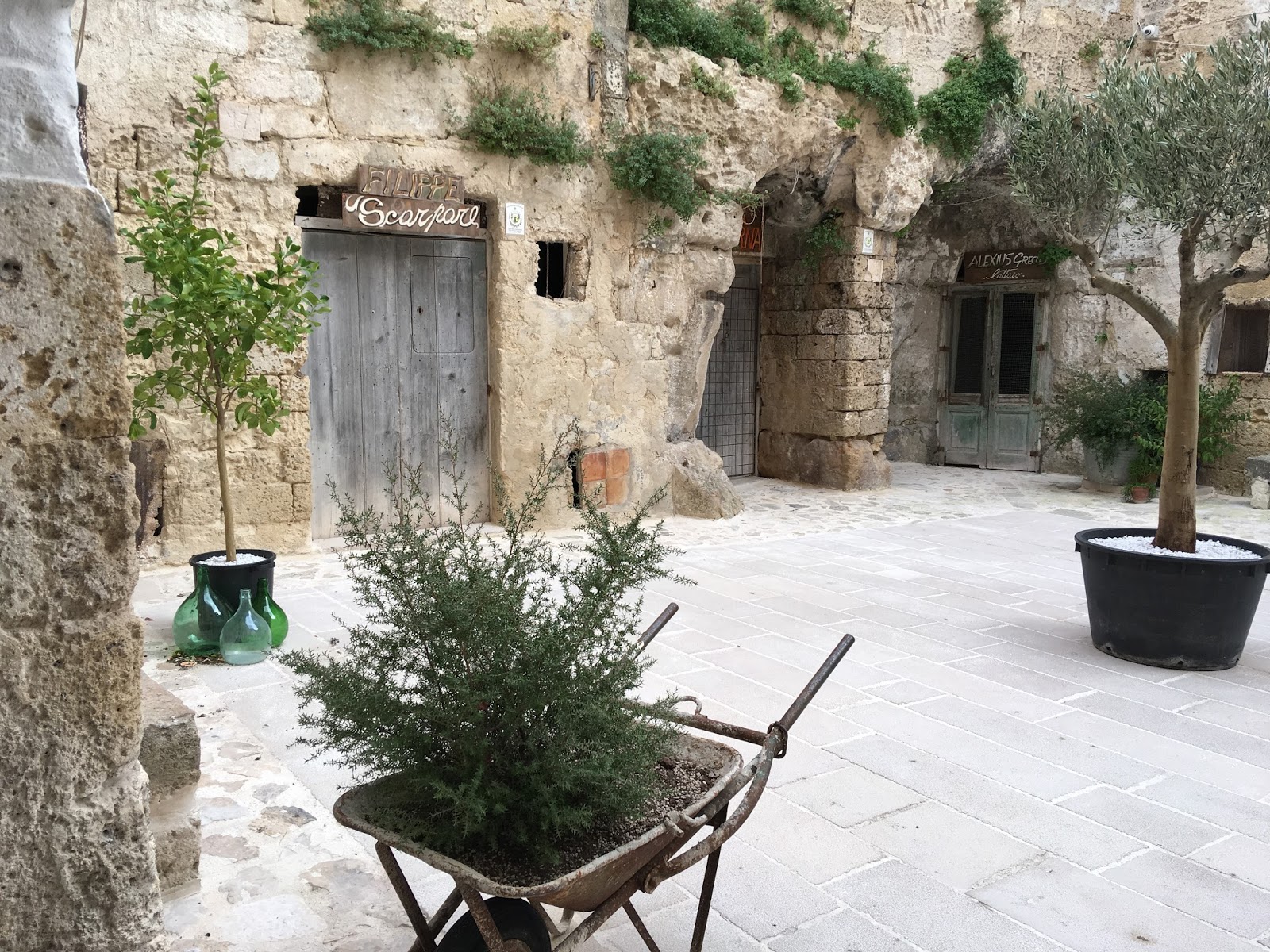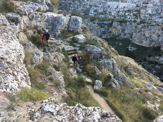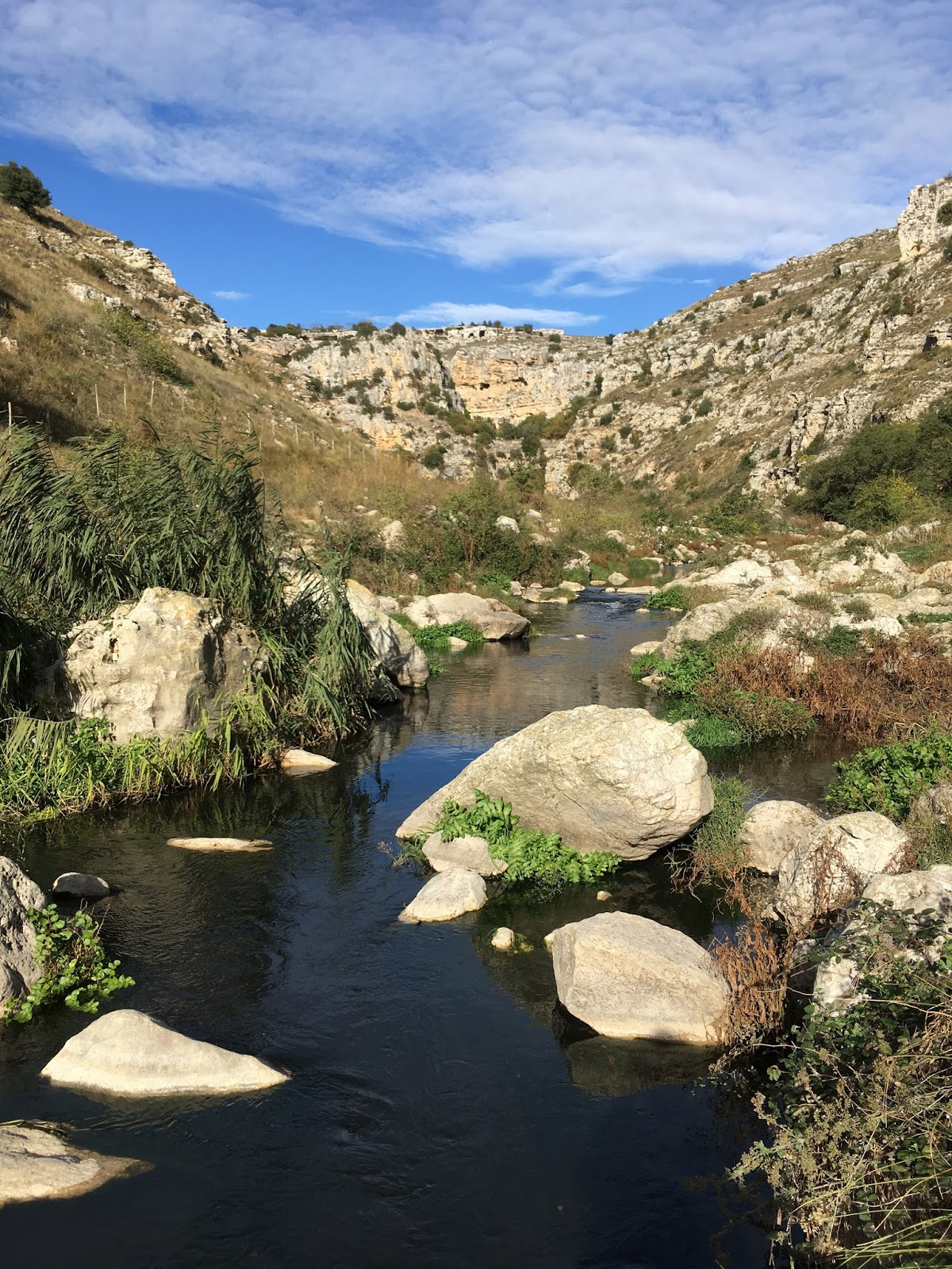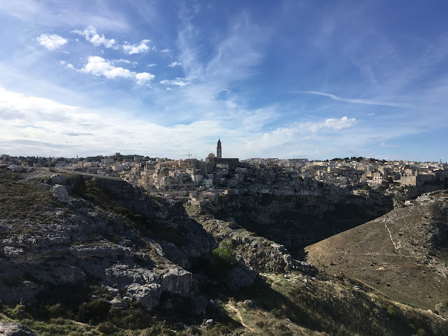 Matera, ko gero vienas labiausiai turistų lankomų regiono miestų (priklauso Basilicata, ne Apulia regionui). Miestas, kuriame, kaip teigiama, žmonės gyveno jau prieš 7000 ar dar daugiau metų. Tik priartėjus prie senamiesčio pasitiko abipus kelio nusidriekusios automobilių eilės, o senamiestyje niekniekių ir suvenyrų siūlytojai. Žmonių čia tikrai daug, nors jau paskutinė spalio diena. Kadaise buvę gyvenami, po to apleisti urvai ir akmeniniai statiniai vėl po truputėlį pildosi. Arčiau centro įsikūrę pardotuvėlės, kavinukės, galerijos ir netgi viešbučiai. Atokesnius urvus, panašu, kad vietiniai naudoja kaip sandėliukus ar panašia – jų angos uždarytos įvairių spalvų ir medžiagų durimis:) Tokiomis gatvelėmis jau jautėmės prisivaikščioję Gravinoje, todėl šiek tiek paklaidžiojus, patraukė dėmesį anapus kanjono matoma apžvalgos aikštelė ir ten esantys žmonės. Ir ne veltui – pasirodo geriausias vaizdas į senajį Matera miestą atsiveria nuo priešingos kanjono pusės. Norint ten patekti, reikia važiuoti kelis kilometrus kryptimi Matera -Taranto (mums padėjo ši nuoroda įvesta į navigaciją: Viewpoint of Matera and the Sassi, Address: Contrada Murgia Timone, 75100 Matera MT). Čia pasitiko ne tik puikus vaizdas, bet ir gamta – žmonių kur ne kur, kalnų takeliais galima nusileisti iki pat upės. Tilto, kuriuo būtų galima legaliai patekti iš vienos kanjono pusės į kitą, nesimatė. Tačiau krantus jungia kabantis “beždžionių” tiltas. Nors lipti ant jo negalima (apie tai byloja plokšte užkaltas užlipimas), bet tiltas atrodė pakankamai saugus ir traukė..:). Šioje kanjono pusėje skaniai susivalgė pasiimti pietūs – maloniai šviečiant saulei buvo smagu įsitaisyti ant uolos ir mėgautis maistu ir nuostabiu vaizdu. Nusileisti iki upės, papietauti, grįžti užtrukome apie dvi valandas, bet, turint laiko ir noro pabūti gamtoje, čia galima užtrukti žymiai ilgiau – kalnų takeliai driekiasi į abi puses tolyn.