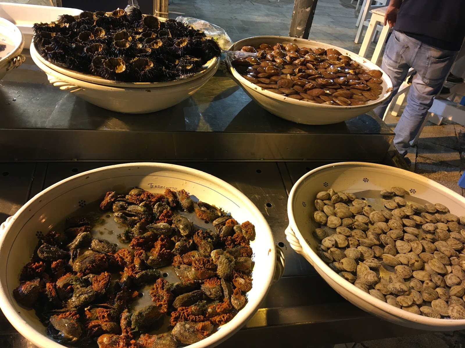 Gallipoli. Į jį atvykome jau visai tamsoje, už savęs palikę vadinamuosius “itališkus maldyvus”, kurie irgi jau skendėjo tamsoje važiuojant pro šalį, todėl taip ir nesužinojom kas tai yra:). Pasivaikščiojus krantine jau ketinome sukti link automobilio, bet uoste užmačiau kioskelius su jūros gėrybėmis ir žiauriai užsimaniau ten pažioplinėti..:) ir ką manote – tai jūros gėrybių turgus šalia žvejų uosto. Išsirenki, iškepa ant grilio, valgai:)! arba valgai žalius – jūros ežius, austres, įvairius moliuskus:) Jūros ežiai – arba mes kažko nesupratom, arba – nei šis, nei tas, bet juos ir davė už dyką:) O visa kita – super!