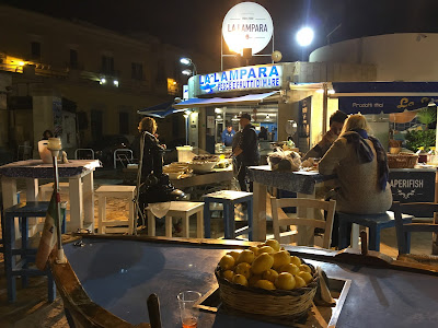 Tad greit teko ieškotis kitos vietos, užsakėme kambarį svečių namuose (Aria di Mare guest house Scirocco), papirko žadamas puikus vaizdas į jūrą ir tai, kad parkingas ir pusryčiai įskaičiuota:)) šios vietos administratorius Leonardo kantriai laukė mūsų iki 22 valandos, kai įsikūrėme pasiūlė kur užkąsti (kambario kaina 3 žmonėms, apie 50 eur). Nors buvo vėloka, bet po kelionės valgyti norėjosi:)) o pagal vietinę tvarką, toks metas vakarienei pats tas, ypač kai šeštadienis. Taigi, šalia esančiame restorane, išbandėme itališką maistą. Kadangi meniu buvo tik itališkai, o padavėjas irgi ne kažkiek galėjo paaiškinti, atsitiktinai užsisakėme tris skritingus patiekalus iš sąrašo, kurį padavėjas pavadino “pasta and fish”. Buvo nuostabu – visiems skirtingų rūšių pasta su skirtingais moliuskais ir kažkokiu vėžiagyviu:)). Šalia baltas vynas, desertui citrininis šerbetas. Už viską sumokėjome 45 eurus.