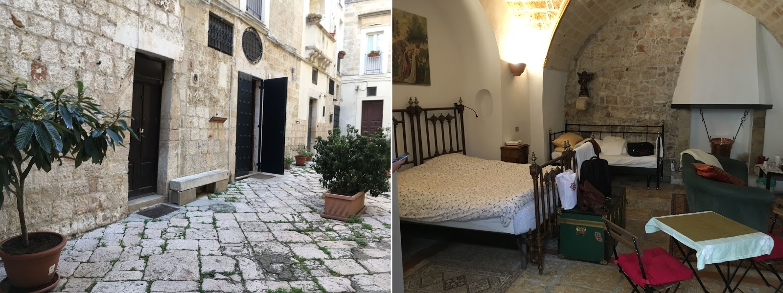 Šios dienos nakvynė Altamura mieste. Nakvynės vieta labai įdomi (American Laudati Suite) – iš pagridinės pėsčiųjų gatvės išsukus į mažesnę gatvelę patekome į uždarą kiemuką, kuriame ir yra šios nakties butukas. Atkeliavome ir įėjome. Šeimininkas amerikietis Brad’as parašė, kad pats išvyksta į Tailandą, todėl pasitikti negalės, bet kiemas labai saugus, todėl butas nerakintas, raktai mums palikti ant salo:) Patalpa be langų, skliautuotos akmeninės lubos, akmeninės sienos, židinio imitacija (gal ten buvęs kada židinys, dabar ten įrengtas virtuvės kampelis). Pirmas įspūdis – wau:) Po to supranti, kad ilgiau pabuvus, pradeda slėgti, bet vis tiek labai įdomu apsistoti:) Dušo kabina kambario kampe, tualetas ir prasutuvė – nišoje:) Išradinga, bet kaip ten telpa didesnių (nei vidurkis) gabaritų žmogus, mums liko mįslė..:) Užtat kaina pati mažiausia per visą kelionę – 35 eur už naktį.