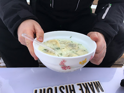 Pietūs šalia keltuvų. Kaip tiksliai pavadinti patiekalą? Tai sriuba su koldūnais – didelis dubuo skanaus sultinio, kuriame bent septyni, visai nemaži, ir labai panašūs į naminius koldūnai. Puikūs sotūs pietūs (du viename, ir sriuba, ir antras). Porcijos kaina 3 eur. Už tiek VU GMC valgykloje vidutiniškai papietausi:)