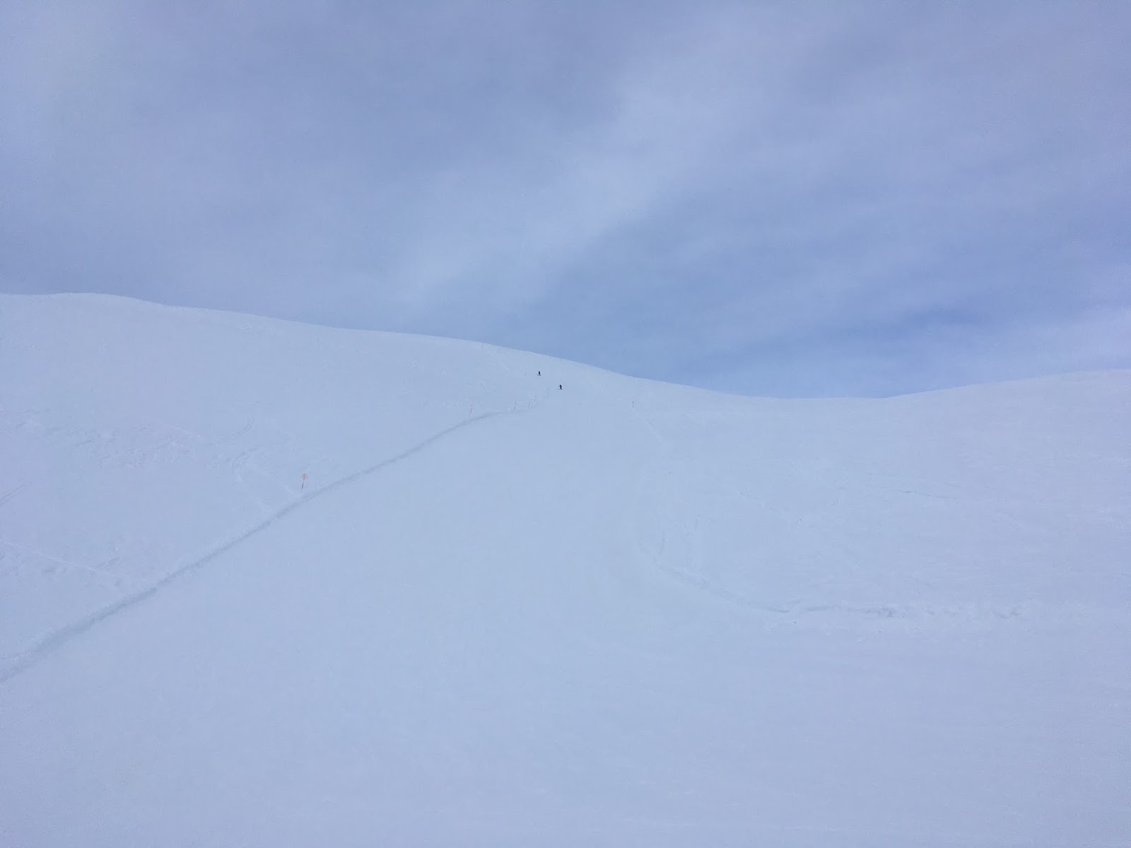 Vaizdas nuo viršūnės.. link kitos viršūnės, kuri prieš porą dienų mums atrodė jau labai aukštai, o dabar – labai žemai.. matosi “raudonoji trasa”, kuria leidžiantis neatrodė, kad ji tokia stati:)