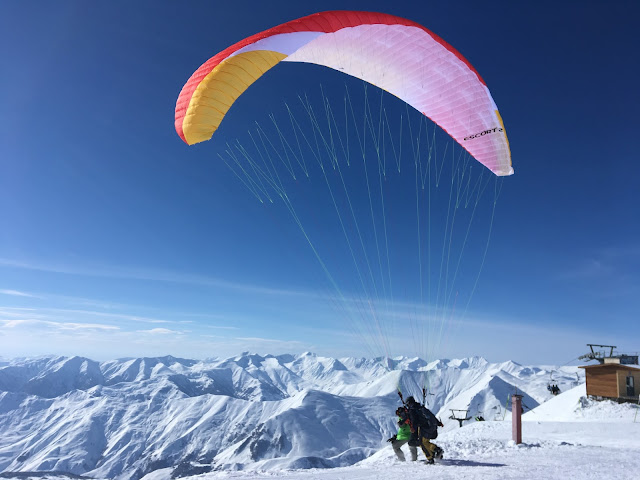 Galima nusileisti ir parasparniu (Gudauri paragliding), jausmas turėtų būti nepakartojamas:) Pilotai-verbuotojai vis klausia – “niexotite polietat?” atsakome “konečno chotim.., no dorogo..” Taigi mes šį kartą tik stebėjome, nusprendėm, kad dviese skristi per brangu, o vienam nesinori:) (kaina dviems apie 170 eur, 15 min.)