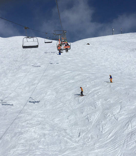 Šeštadienis, žmonių žymiai daugiau. Daug be slidžių, besikeliančių pažiūrėti į kalnus, pasifotografuoti.. Smagu stebėti vaikų būrelius – lydimi kelių suaugusiųjų aprengti ryškiomis liemenėmis jie įdėmiai klauso kas jiems sakoma, o po to visai šauniai leidžiasi trasomis žemyn..:))