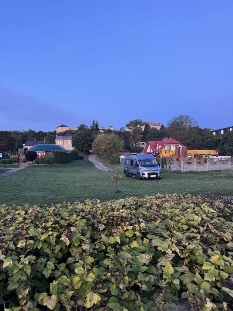 Pravažiavę apie 5 val., pirmai nakvynei sustojome Lomža miesto pakraštyje, pievelėje šalia upės 😉 vietą, kaip ir visas kitas nakvynės vietas šioje kelionėje, radome programėlės park4nigt pagalba. Atvykome tamsoje, vakaras rudeniškai šaltas, tad greit įsitaisėme miegoti, viduje šilta ir gana patogu 🙂
