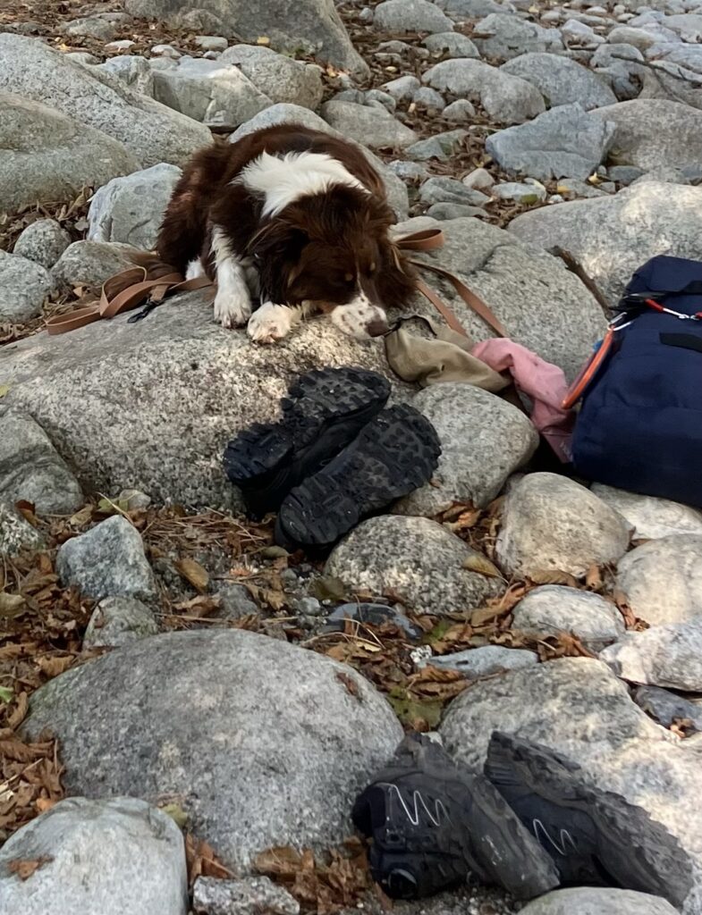 Kad ir kaip gražu, amžinai toje vietoje neliksi ..:) grįžimas šiuo taku laiku ilgesnis ir sunkesnis.. parėjus Niki krito stipriai lekuodama, gerokai mus išgąsdino – gal perkaito.. klojom šlapiais rankšluosčiais, sėdėjau su ja ant grindų kol grįžome iki kempingo.. bet grįžus ji jau vėl smagiai iššokavo iš automobilio..:) matyt buvo tiesiog pavargusi..:) vis dėl to, tolesnius keliones hike’us jau rinkomės atidžiau, kad princesė 🐕 neperkaistų..:)