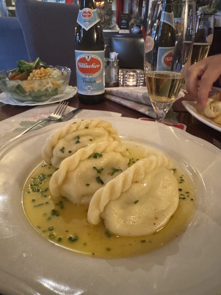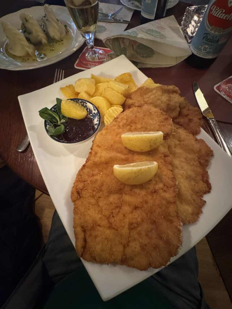 Austrijoje neplanavome užtrukti, bet kaip gi ją kirsi nesuvalgius šnicelio ?:) Tam užsukome pasienio miestą Villach, kur mielame restorane … s Stadtschenke sukirtome po porciją vietinių patiekalų – milžiniško dydžio šnicelio porciją, kurią sudarė du dideli bet plonyčiai kepsniai su bulvytėmis ir virtinius su sūriu ir žolelėmis, kurie buvo patiekti su didele porcija salotų (virtiniai mano vienas iš favorit patiekalų kur bekeliaučiau, šie buvo 😋 ..:)