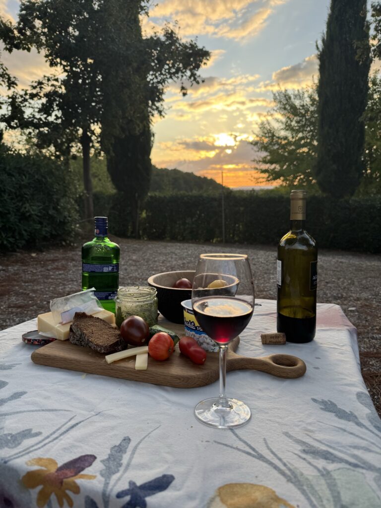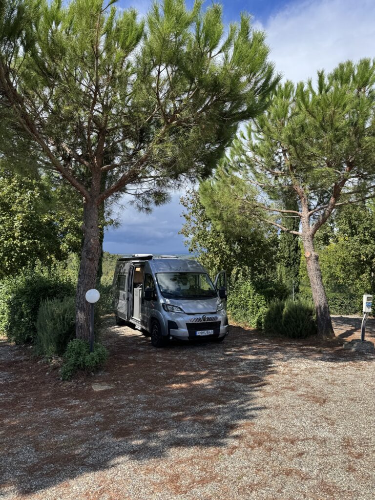 Planavome apsistoti nakvynei ūkyje, kuriame įrengta aikštelė keliautojams. Pagal atsiliepimus tai ypač gyvūnams draugiška vieta, laisvai vaikštinėja draugiški jų šunys, tad tikėjomės kad ir mūsiškė pagaliau gaus kiek laisvės palakstyti be pavadžio. Nes kol kas visur tik su juo. Deja, labai nusivėlinome atvykti, apie 9 val. šeimininkai matyt jau nesitikėjo keliautojų, tad vartai buvo užrakinti.. jėgų dar kažkur toli važiuoti nebebuvo, tad nakvoti susiradome tiesiog ramų, saugiai atrodantį parkingą nedideliam miestelyje. Ramiai išmiegoję, ankstyvą penktos dienos rytą vėl leidomės į kelią per Italiją. Tikslas po 5-6 val pasiekti kempingą ūkyje šalia Cecina miestelio ir ten, jau be važiavimo praleisti antrą dienos dalį, vakarą ir ryt rytą, iki tol kol reiks išvykti į Livorno, į keltą.