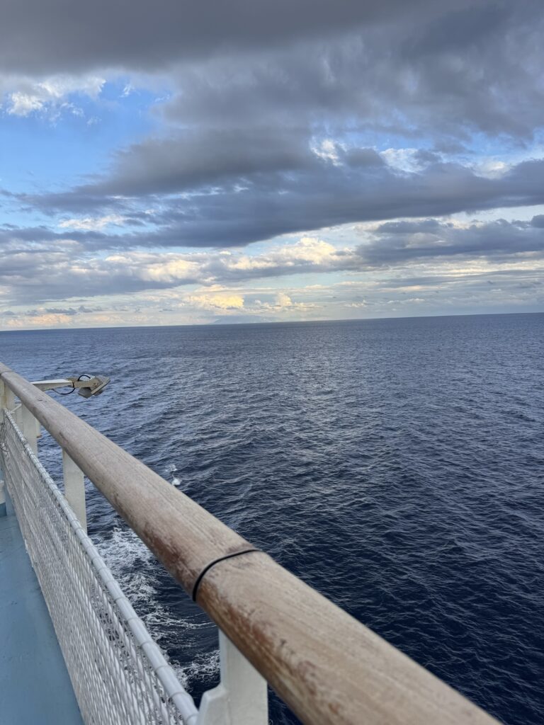 Šešta kelionės diena, jos tikslas – keltas iš Livorno į Bastia. Rytas lėtas nes keltas išplaukia tik 14 val., o mes netoliese.. kelto bilietus pirkausi iš corsica ferries svetainės prieš tris dienas. Uoste rekomenduojama būti mažiausiai valandą iki išplaukimo. Bet atvykstame žinoma anksčiau nes pirmas kartas – gal nerasime, gal dar kas nutiks ..:) tad laukti atviroje aikštėje prie kelto automobilių, kemperiu ir motociklų būryje tenka ilgokai. Pamaniau, kad jei plaukti vasarą, geriau būtų rinktis rytinį keltą, laukimas anksti ryte toje aikštelėje būtų lengvesnis nei vasaros kaitroje vidurdienį. Bent šiuo metu Corsica Ferries iš Livorno į Bastia plaukia 8 ir 14 val. Plaukimo trukmė 4,5 val. Galima įsitaisyti patogiuose krėsluose viduje, arba vienoje iš daugelio erdvių keliuose deniuose. Dauguma, kaip ir mes, šmirinėja – pabūna vienoje vietoje, pereina į kitą. Smagiausia žinoma, žvalgytis po jūros platybes, bet gan stiprus vėjas nuo, kurio norisi ir pasislėpti.