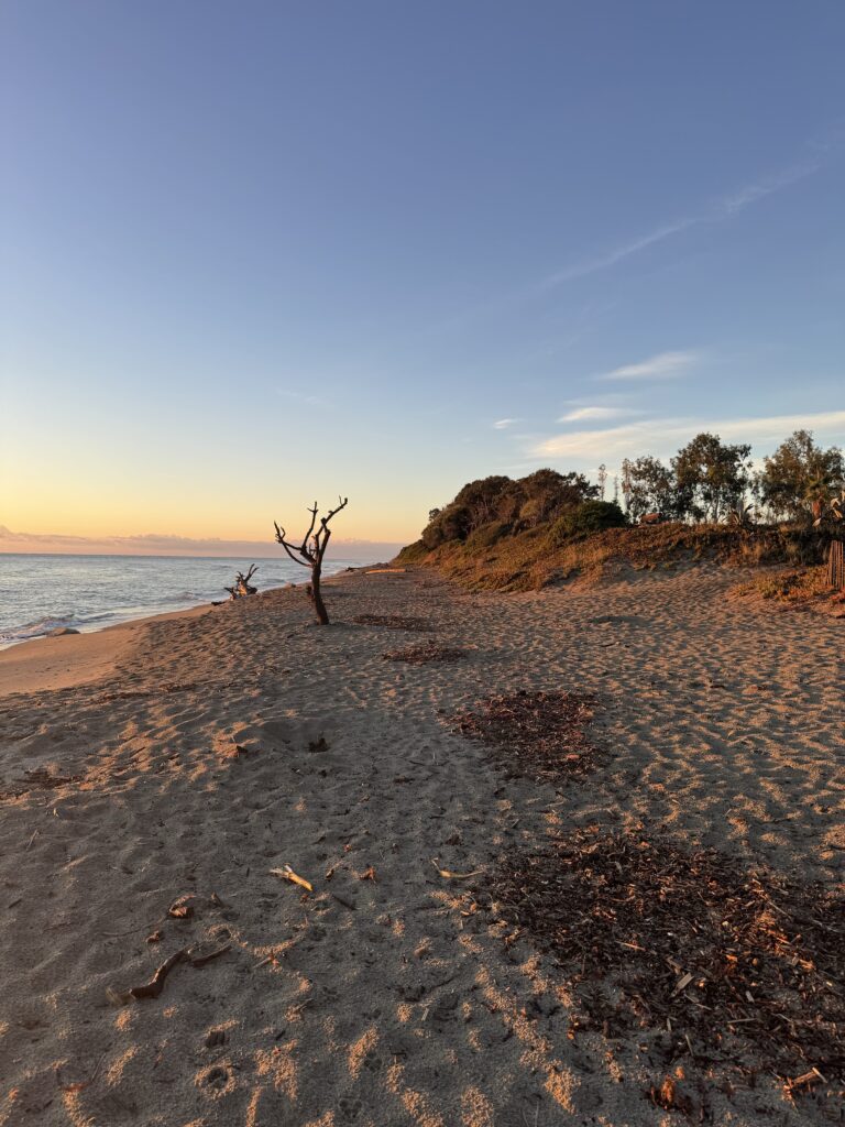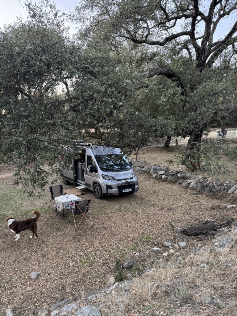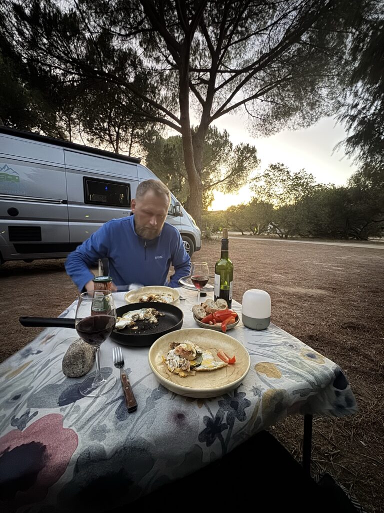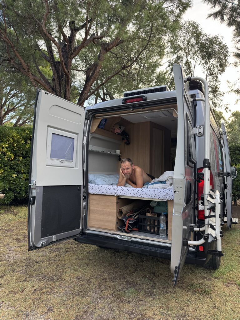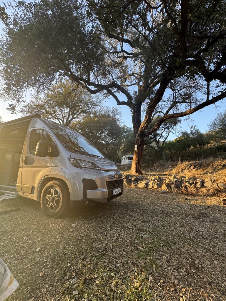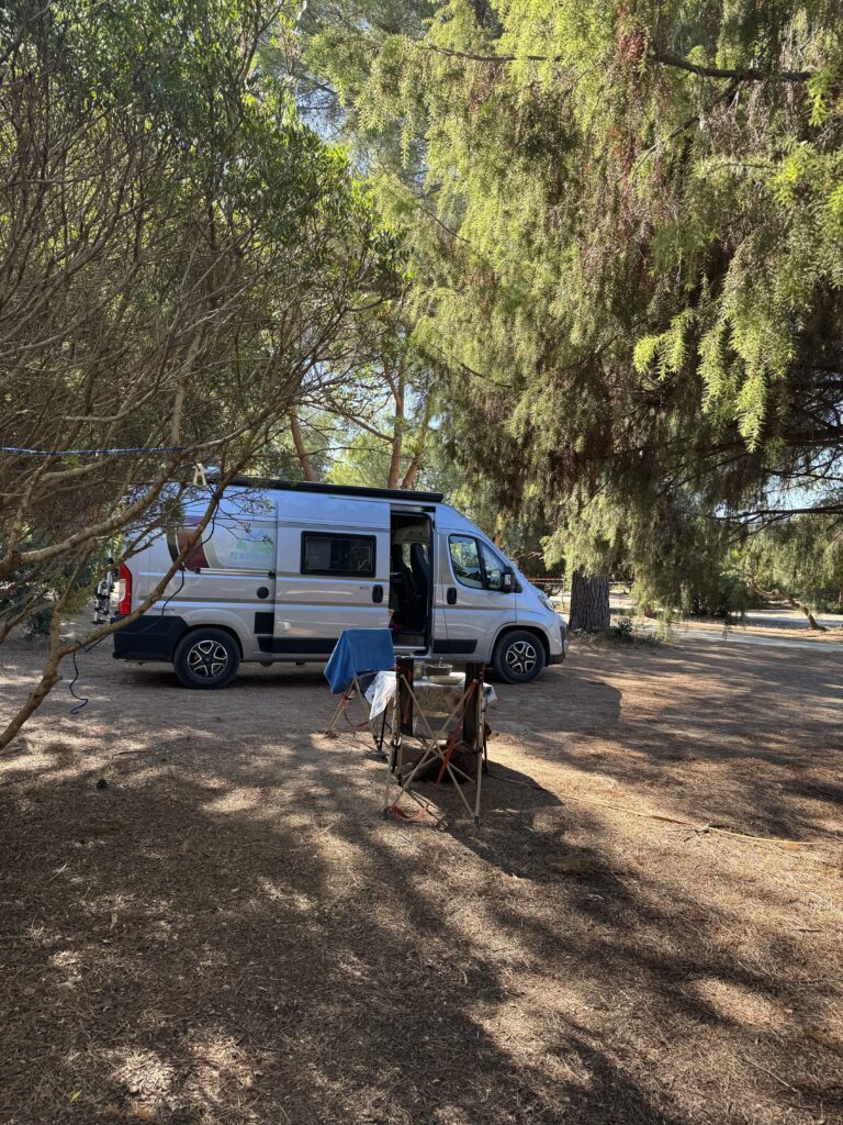 Šiame kempinge daugiausiai keliautojų susiradę vietas didelėje pievoje su šiek tiek medžių, ten patogu nes ant žolės (mažiau smėlio nešasi į kemperio vidų) ir netoli dušai/WC. Bet mes ieškomės atokesnės vietos, kad mažiau dirgiklių ir mums ir aplinkiniams 😉 ir randame nuostabią aikštelę (pitch) kempingo pakraštyje, kur rytą gali pasitikti atviromis durimis su puikiu vaizdu tiesiai iš lovos ..:) čia praleidžiam tris paskutines naktis Korsikoje.