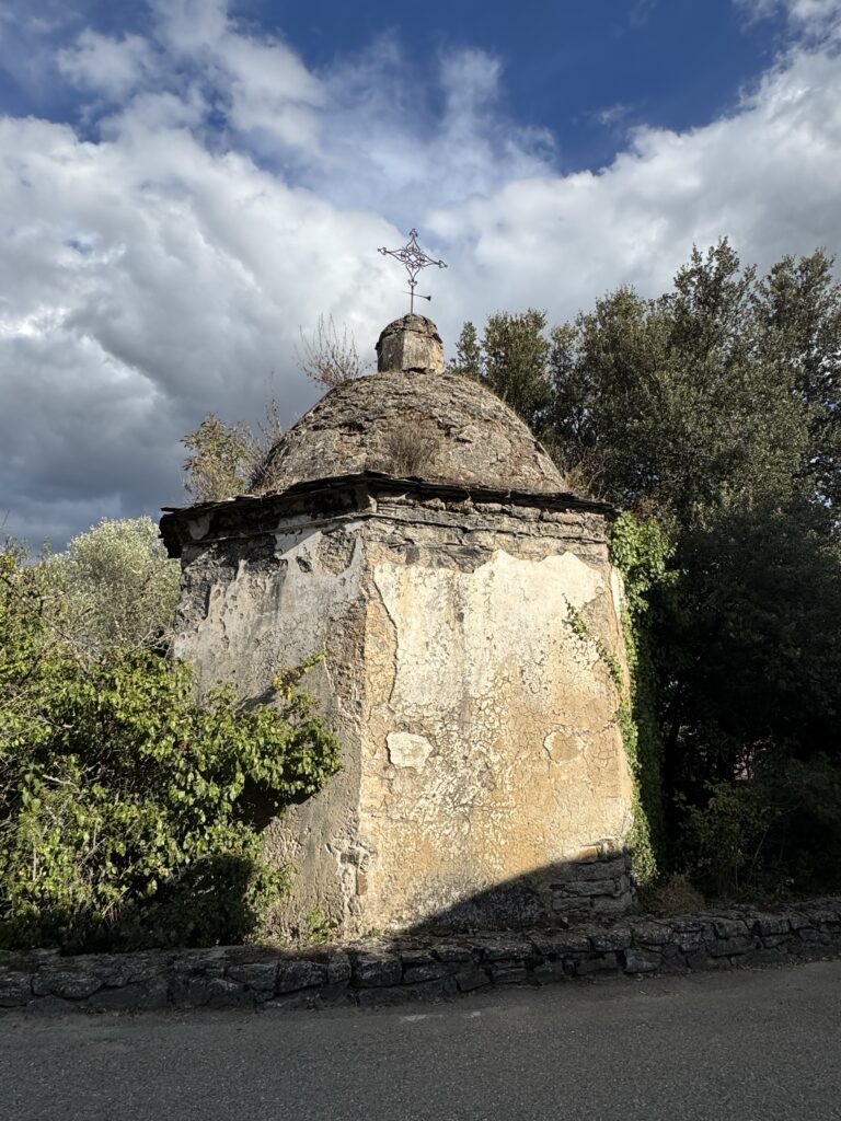 Kaštainiai Korsikos ir ypač šio regiono medis. Nuo senų laikų žmonės čia juos augino ir naudojo maistui – kaip daržoves, kaip vaisius , o pagrinde miltams. Rašoma, kad valdant genujieciams, maždaug XVI a. galiojo įsakas, kad kiekvienas salos gyventojas per metus turi pasodinti bent 10 kaštainiu..:) tai prisodino tikrai 🙂 ir jie įspūdingi – stori, šakoti, šiuo metu apsipylę spygliuotai pūkuotomis vaisių dėžutėmis. Pavasarį turėtų būti nuostabu kai jie žydi. Evisa miestelyje susigundėme paragauti pyragėlio iš kaštainių miltų, skanus;)