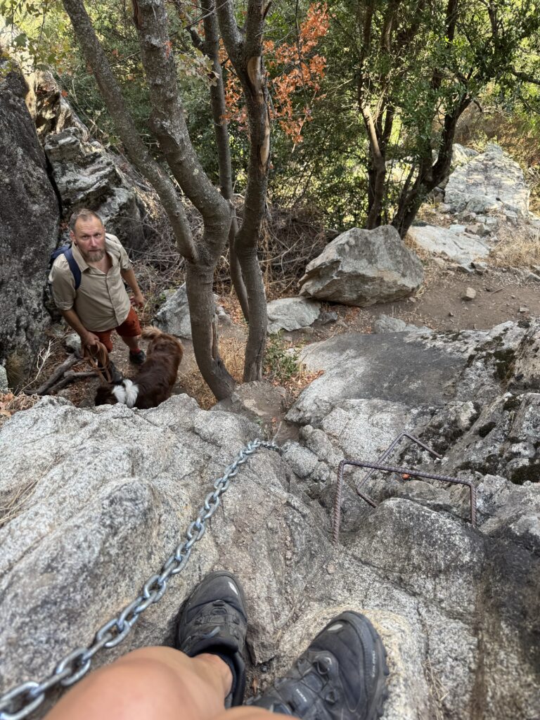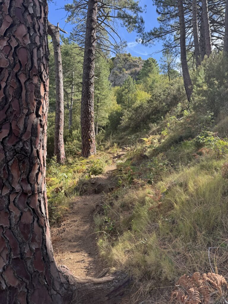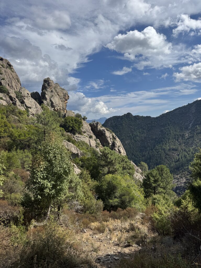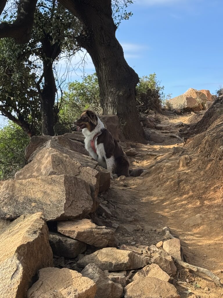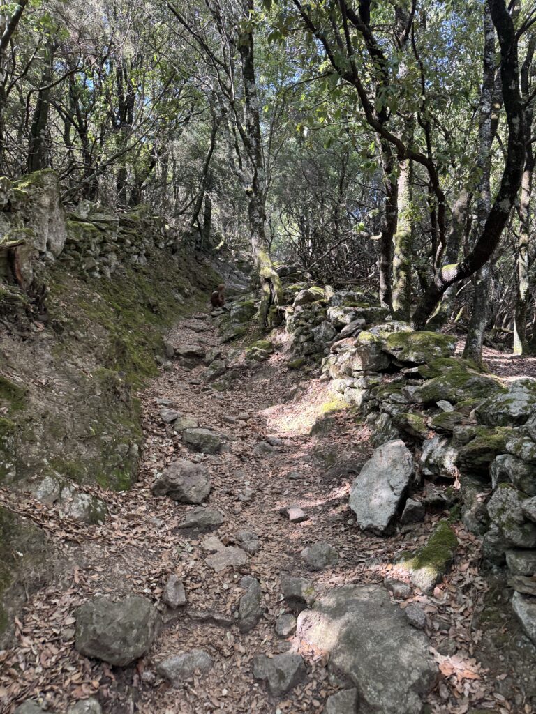 Pakeliui stabtelėjome pasivaikščioti tarp Porto ir Piana. Maršrutas (apie 3o min į vieną pusę) vadinasi Tête du Chien, pradžioje eina pavėsingu miško taku, vėliau akmenų laiptais. Jo gale įspūdingo grožio uolos ir vaizdas į Porto įlanką. Čia jau vėl labai maloniai šilta, apie 22 laipsnius 🙂