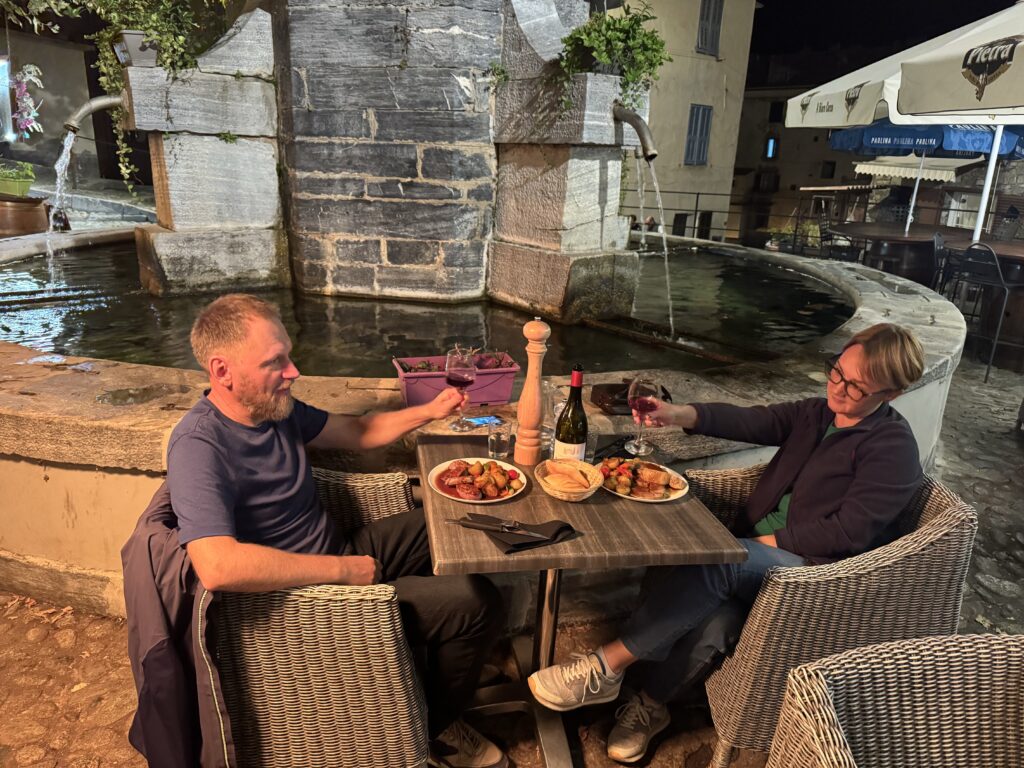 Prieš ir po vakarienės pasivaikščiojome po miestelio centrą ir palei per jį vingiuojančią upę – gražu, jauku, būtų galima ir ilgiau čia pabūti..:) net oras jau visai malonus 😊, bet leidžiamės į kelią, ketvirtojo kelionės vakaro nakvynės tikslas jau Italijoje.