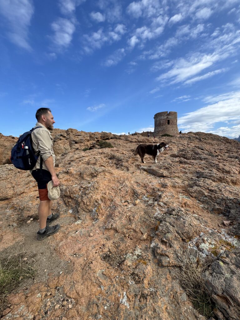 Ryte (12/5 keliones/Korsikos diena) su Niki dumiam prie jūros išsimaudyti, o po pusryčių į žygį Capo Rosso iškyšulyje. Iki žygio starto iš parkingo nuo mūsų kempingo 9 min važiavimo vaizdingu serpantinu. Nors atvykome ryte, po 10 val., aikštelė jau gana pilna, kai kas joje valosi dantis, matyt čia nakvojo, nors tai nelegalu..🙈 žygio tikslas genujietiškas bokštelis milžiniškos rausvos granito uolos, kuri yra iškyšulio gale, viršuje. Genujietiškų bokštelių, geriau ar prasčiau išsilaikiusių, matosi visoje saloje, valdant Genujos respublikai, bokšteliai buvo įrengti gynybos tikslais.