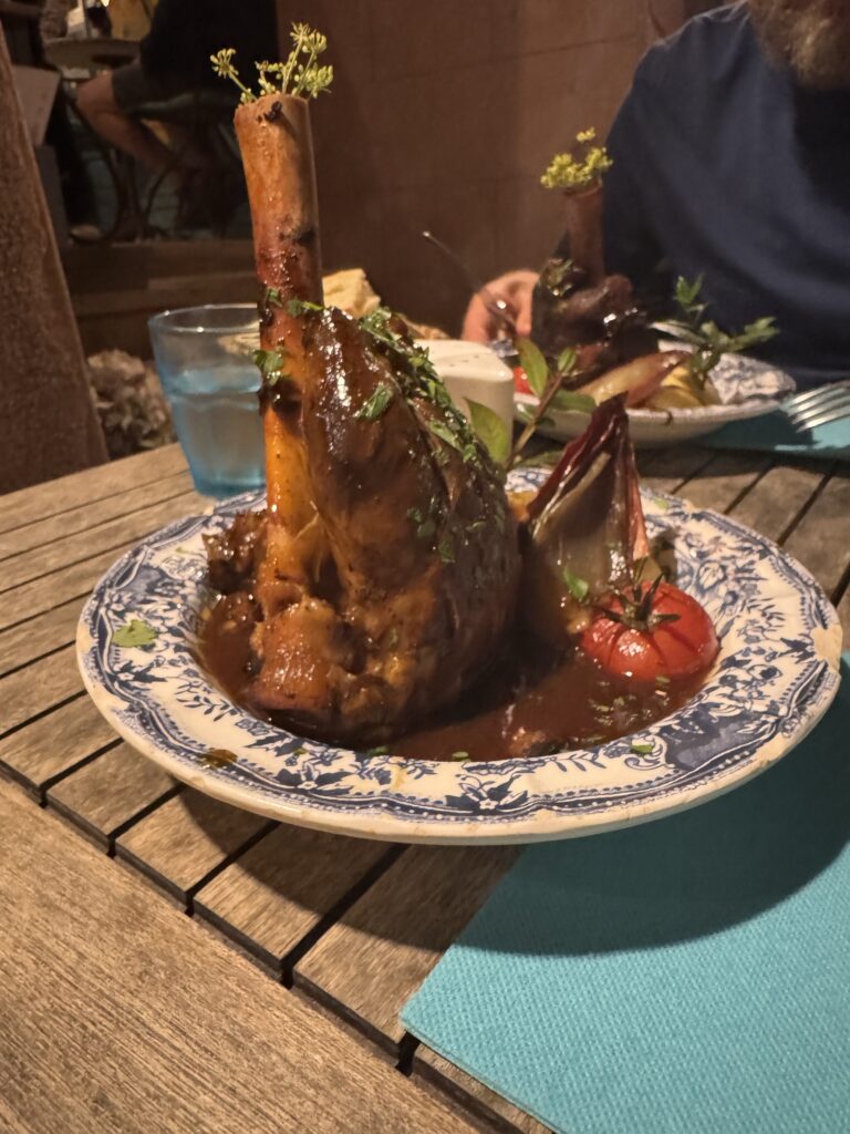 Po žygio paliekam Niki snausti kemperyje ir keliaujam vakarienės restorane prie fontano, kur stalo vanduo atkeliauja iš fontano.. 😉 Maistas (veršienos ir avienos patiekalai) geras, aplinka jauki ..:)