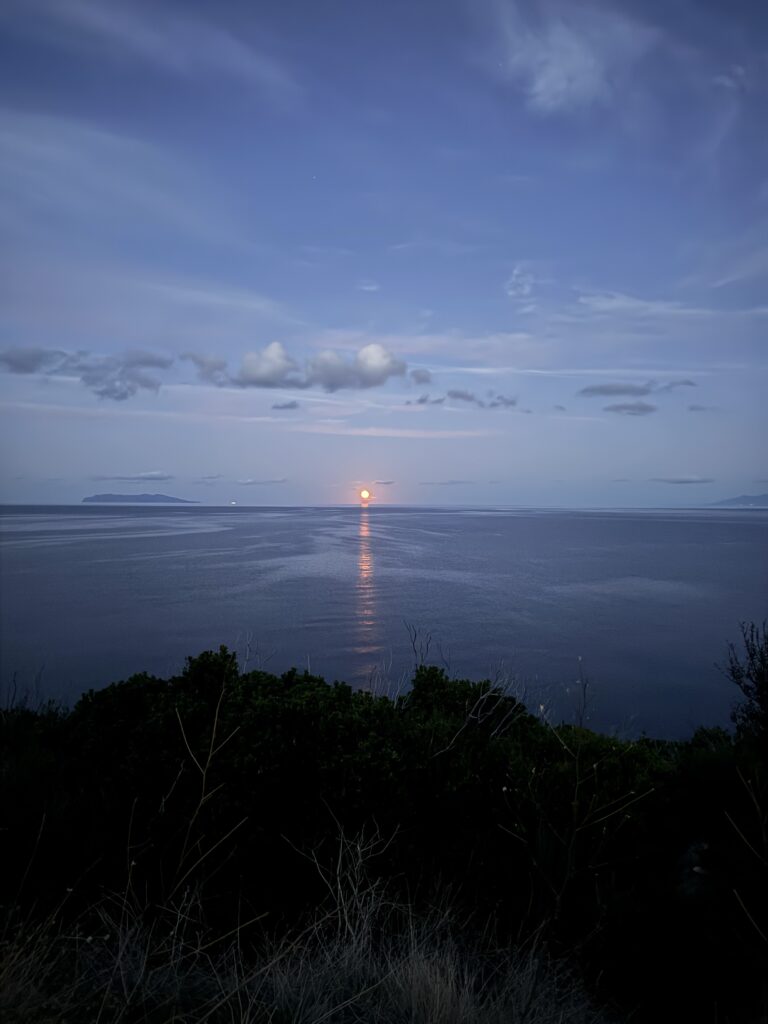 Atstumas nedidelis, bet greitis nedidelis taip pat 🙂 tad kelionės tikslą, kempingą La Pietra, pasiekiam jau visiškoje tamsoje, virš ramutėlės jūros tekant mėnulio pilnačiai.